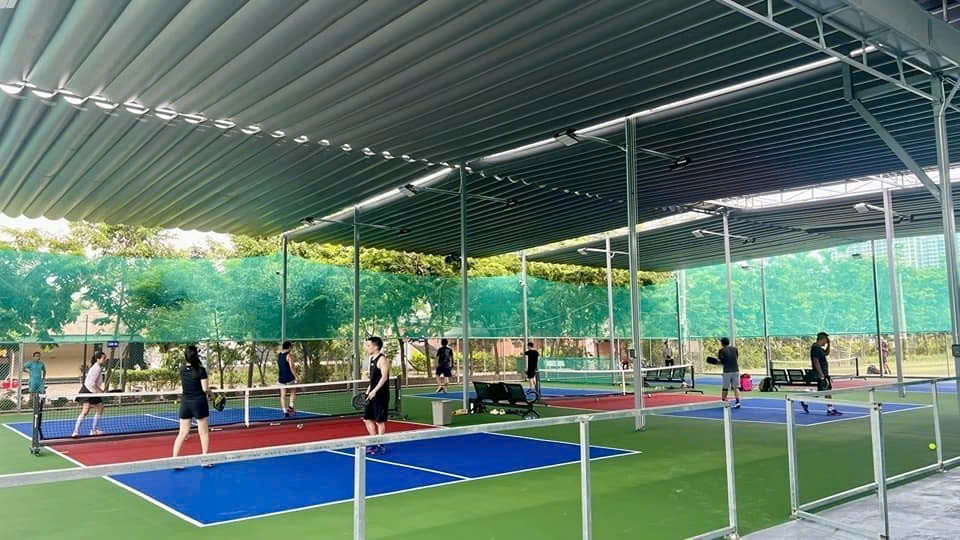 Bạt xếp lượn sóng che mái sân Pickleball ngoài trời chống nắng mưa tại Long Biên, Hà Nội