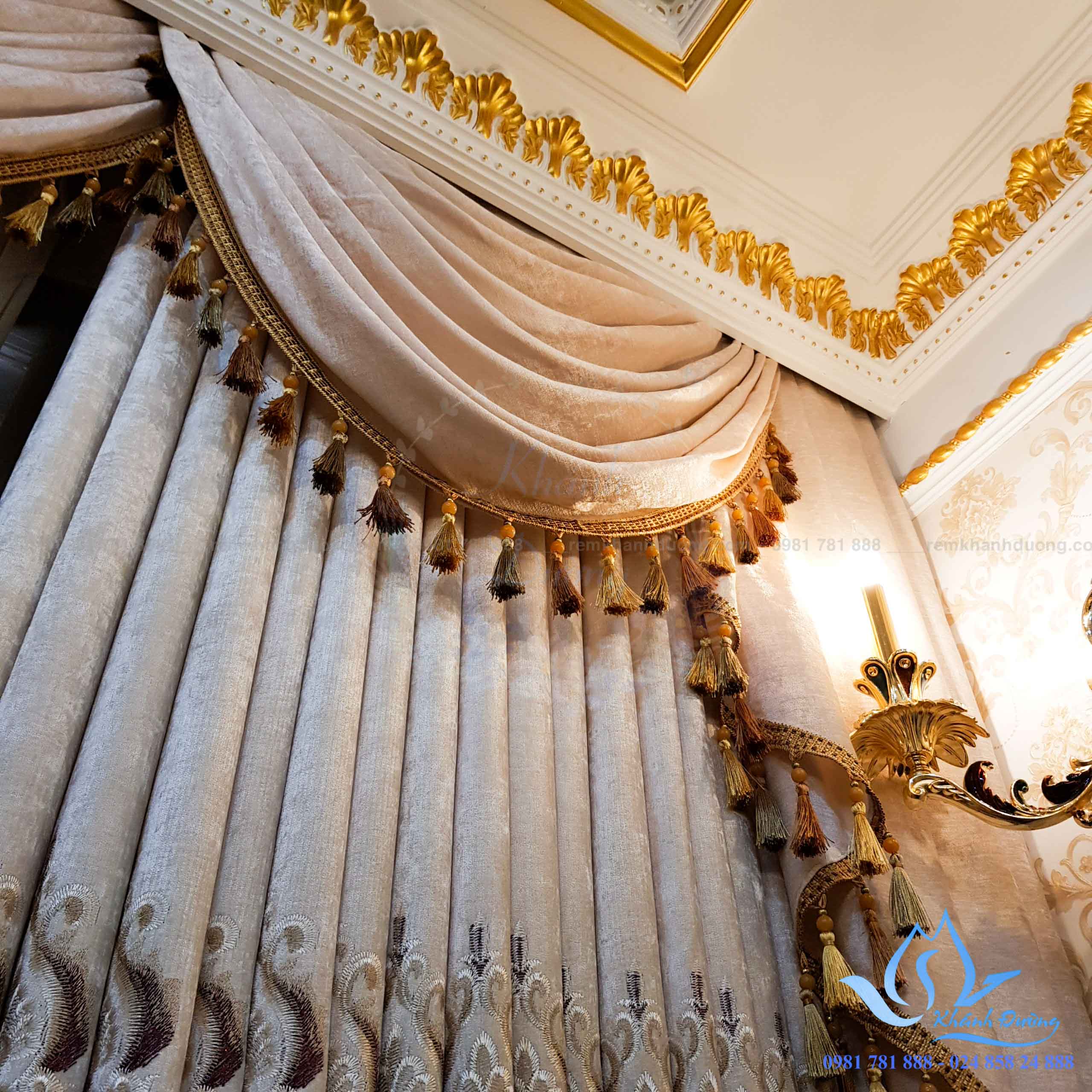 Chất liệu rèm tân cổ điển HN91 tại rèm Khánh Đường gồm vải voan cát thêu họa tiết (lớp trong) và vải thô màu trắng cùng họa tiết khổ lớn (lớp ngoài và yếm rèm). Đây đều là những chất liệu cơ bản và quen thuộc khi may rèm cổ điển.
