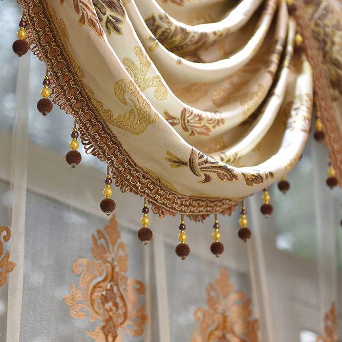Với tông màu sáng cộng thêm họa tiết cổ điển quen thuộc, mẫu rèm toát lên sự sang trọng mà không kém phần tinh tế. Hoa văn màu nâu nổi bật trên nền vải màu ngà đem lại sự hài hòa đến bất ngờ. Vẫn trung thành với điểm nhấn là các hình vòng cung tuy nhiên mẫu rèm này có điểm đặc biệt là các chùm hạt nhựa được gắn dọc theo các hình vòng cung tạo nên nét độc đáo cho mẫu rèm.