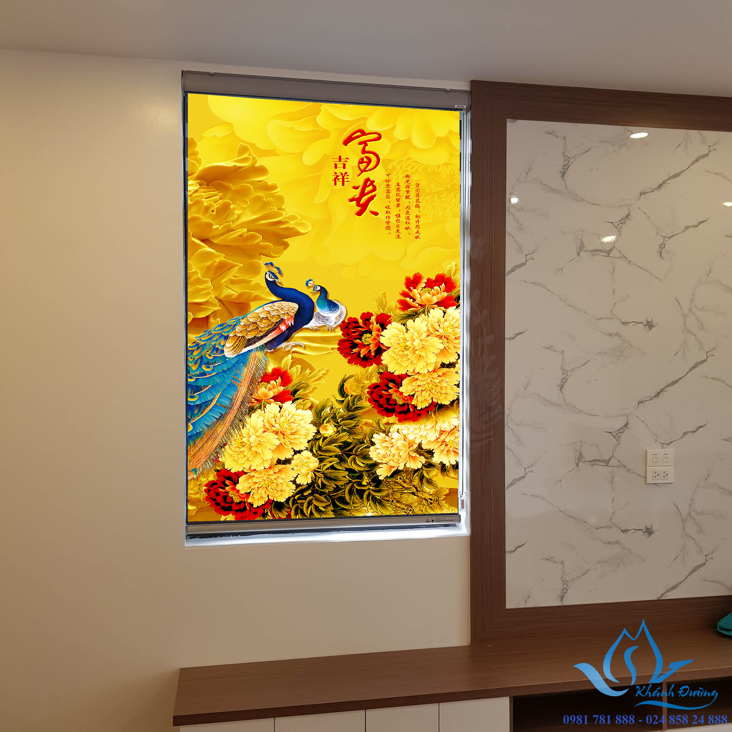 Rèm in tranh công phượng mới nhất của Rèm Khánh Đường. Với không gian phòng ngủ đơn giản thì các bạn có thể chọn thêm 1 bộ rèm cuốn tranh tạo điểm nhấn nổi bật cho căn phòng mình. Hộp phụ kiện rèm tranh được lắp đặt gọn gàng và chắc chắn trong khung cửa sổ. Màu vàng nổi bật cùng chú chim công xinh đẹp bên nhành hoa sẽ giúp căn phòng bạn thực sự nổi bật và ấn tượng.