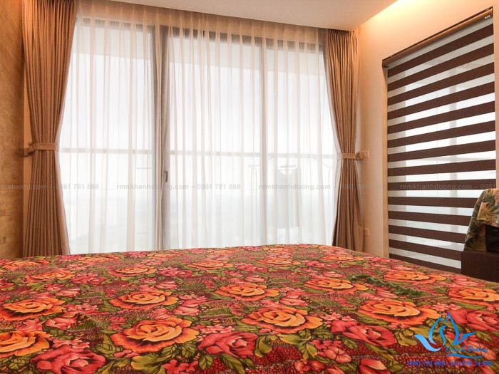 Phòng ngủ căn hộ chung cư thường được thiết kế với 1 giường lớn chính giữa phòng và 1 cửa kính lớn trong suốt lấy ánh sáng cũng như giúp mọi người có thể mở ra ban công hóng gió, thư giãn. Nhằm tạo sự kín đáo, riêng tư cho không gian phòng ngủ, gia chủ đã lựa chọn lắp đặt bộ rèm vải hai lớp TM88627. Với hai lớp vải thô và voan mỏng, chúng ta sẽ dễ dàng hơn trong việc điều chỉnh ánh sáng trong không gian của mình. Tấm đệm trải giường với những đóa hoa hồng lớn dưới ánh đèn vàng phòng ngủ trông rực rỡ và thật sinh động. Mỗi buổi sớm, khi nắng chiếu qua khung cửa với lớp rèm voan mờ mờ, nhẹ nhàng, vườn hồng ấy trông càng quyến rũ và tươi đẹp biết bao nhiêu. Ngoài ra, gia chủ cũng rất sáng tạo khi kết hợp rèm vải hai lớp cùng rèm cầu vồng. Khung cửa lớn lắp đặt rèm vải hai lớp sang trọng, đẳng cấp, khung cửa sổ nhỏ lắp rèm cầu vồng tiện nghi, hiện đại.