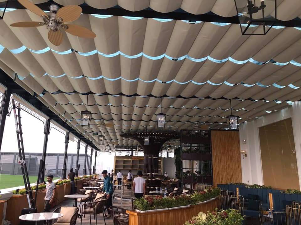 rèm trần che mái kính cho quán cafe tại sân golf Long Biên