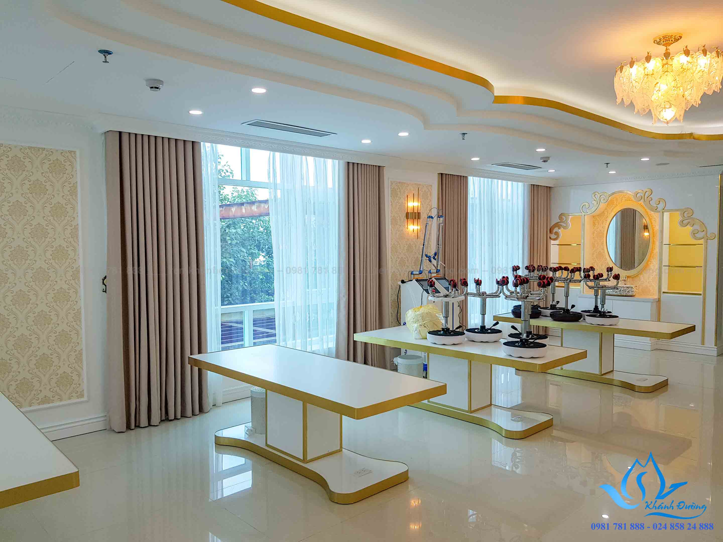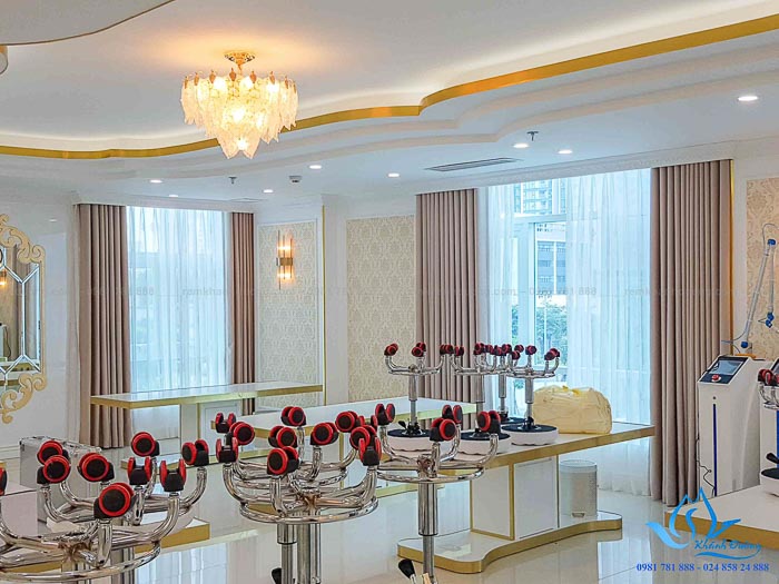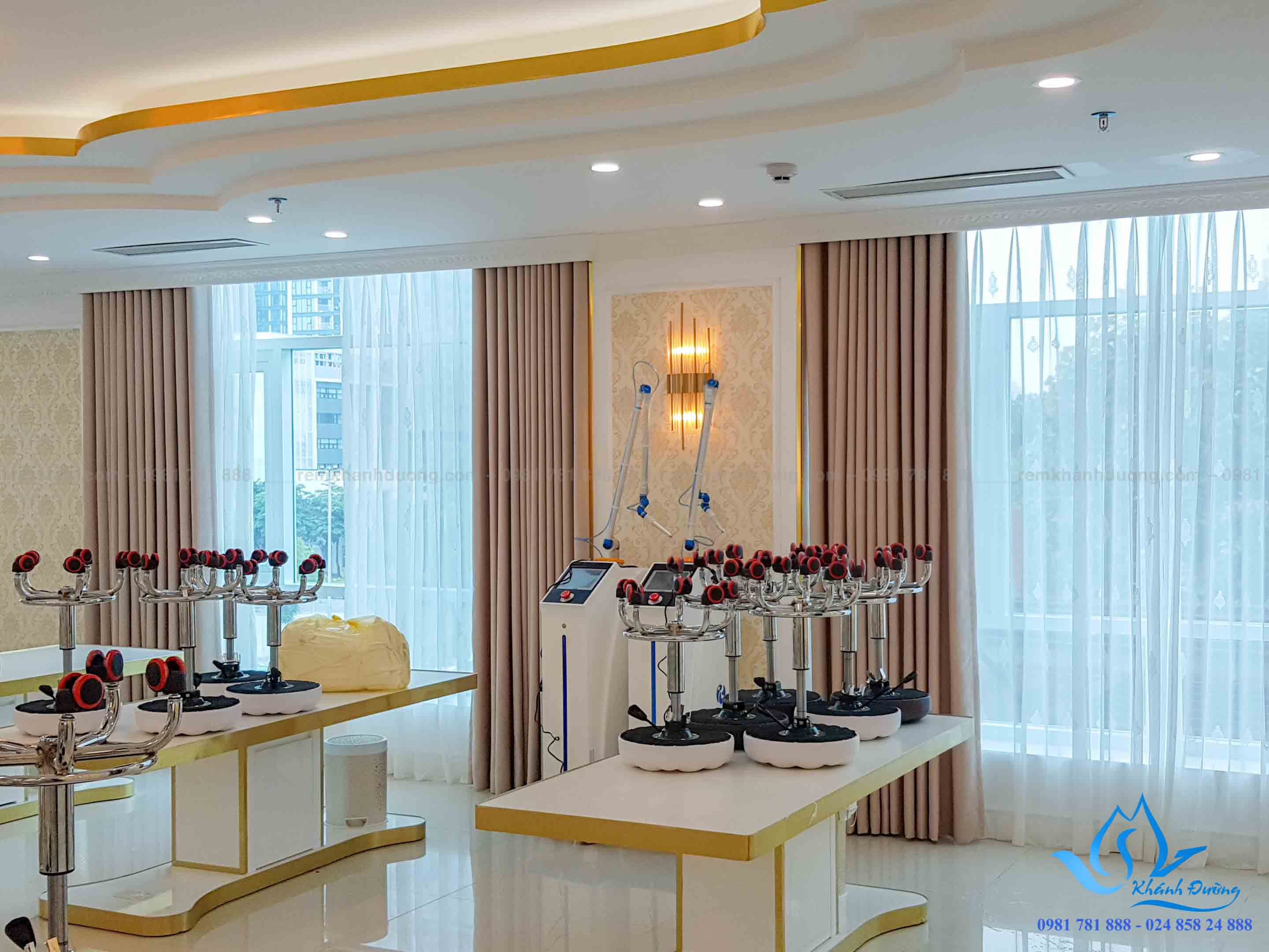 Với đặc điểm không gian sử dụng nhiều đèn trần nhỏ, tường được sơn vàng nhạt cùng thiết kế cổ điển tạo sự đẳng cấp và thanh lịch, thẩm mĩ viện Xuân Hương đã lựa chọn lắp đặt mẫu rèm với màu vàng kem ánh nâu giúp tạo sự ấm cúng nhưng vô cùng dễ chịu cho căn phòng.
