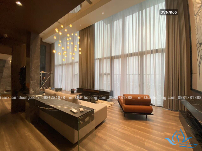 Rèm thông tầng là một xu hướng mới trong thiết kế những năm gần đây, ra đời cùng với đột phá trong xây dựng xây nhà theo kiểu kiến trúc thông tầng, nhằm manglại cho ngôi nhà có một không gian cực kì tráng lệ và sang trọng, giúp lấy nhiều ánh sáng tự nhiên vào và làm thông thoáng cho không gian sống bên trong. Rèm vải thông tầng thường được sử dụng để trang trí nội thất và tạo ra không gian thoải mái, hiện đại trong các phòng khách, phòng ngủ, hoặc văn phòng làm việc. Trong bài viết này, Rèm Khánh Đường sẽ giới thiệu đến quý khách một mẫu rèm vô cùng thu hút. Đây là mẫu rèm thông tầng được thiết kế theo phong cách thanh lịch, sang trọng dành cho phòng khách. Mẫu rèm này được chị Linh lựa chọn cho phòng khách căn biệt thự gia đình mình tại Tây Hồ, Hà Nội.