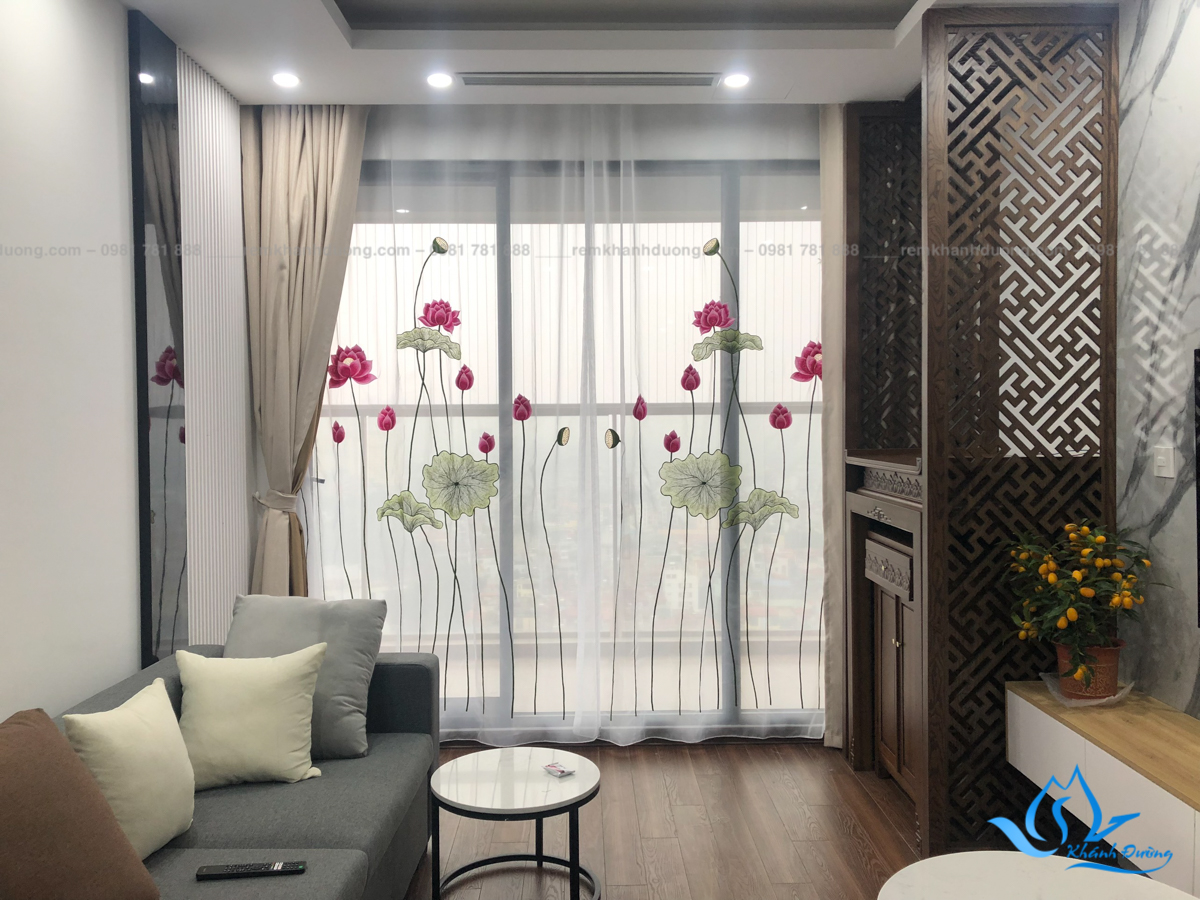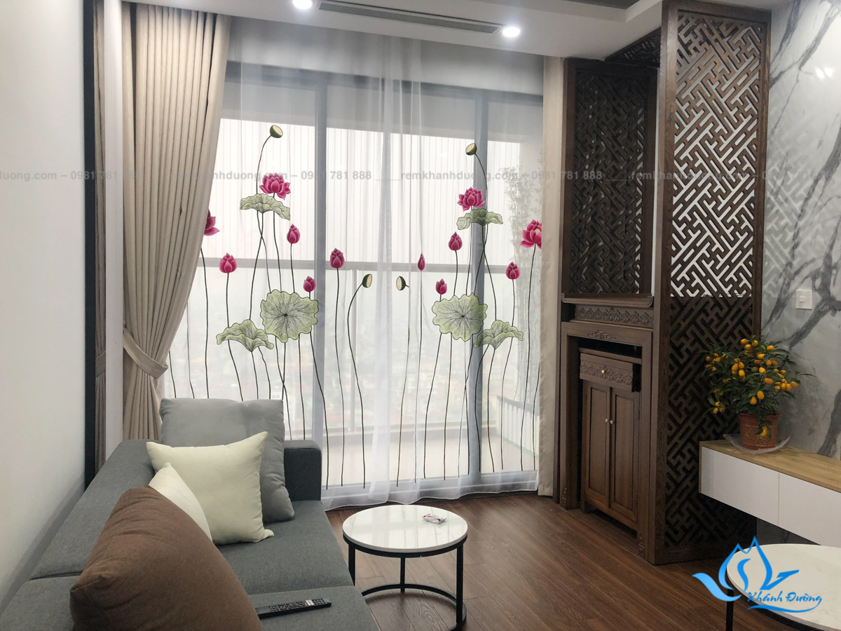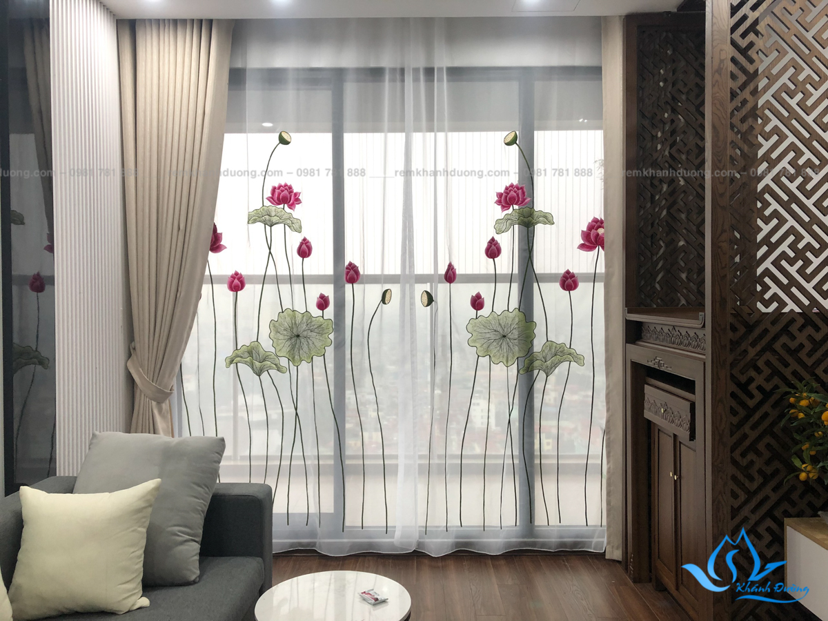 Rèm voan thêu tay hoa sen nhà Chị Nguyệt Tháp Thiên Nhiên Kỷ