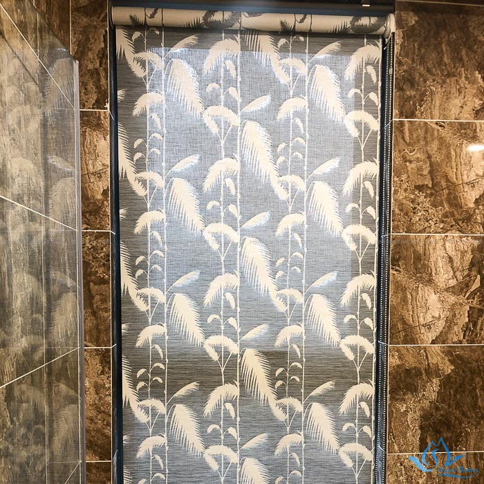 Tuy nhiên thay bằng lớp vải rèm kín che chắn toàn bộ như rèm cuốn thì rèm cửa đẹp RL01 có cấu tạo dạng lưới nên rèm cho phép một phần gió và ánh sáng xuyên qua, tạo không gian thoải mái và thoáng mát, tránh sự ẩm mốc khi tiếp xúc với hơi nước phòng tắm. Lớp lưới thoáng khí được đan khít với nhau đảm bảo kín đáo cần thiết trong không gian như phòng tắm gia đình. Nhằm giúp bộ rèm trở nên đẹp và độc đáo hơn, các nhà thiết kế rèm cửa đã bổ sung thêm phần hoa tiết là những bông lau trắng trên nền đen tinh tế và thu hút.